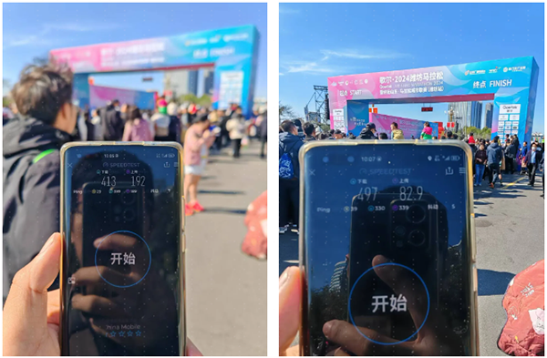 测试人员对赛事路线多次进行拉网工作,在15个计时点位测试发送抖音、微信朋友圈均未发生卡顿,用户感知良好,从测试图可以看出,在用户数量众多的情况下,网络下载和上传速率都表现正常,现场测试5G下行速率稳定在400Mbps以上,上行速率稳定在80Mbps以上,可供用户正常使用,微信、抖音等主流APP使用无卡顿。
